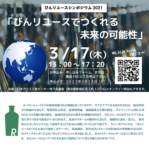 2022年3月17日(木)日本ガラス工業センター 地階会議室にて、びんリユース推進全国協議会主催で「びんリユースがつくる未来の可能性」をテーマに、市民・行政・事業者などのステークホルダーが一堂に会して考えるシンポジウムを開催しました。
